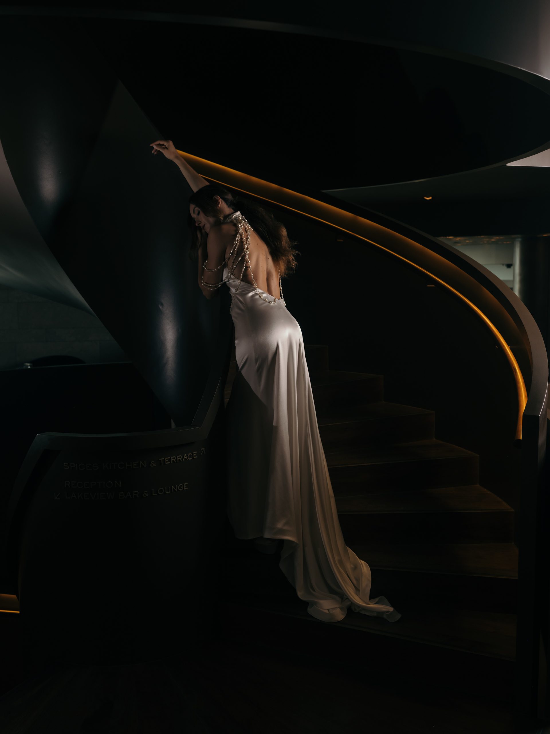 This Floor-Length Ivory Gown, crafted from a super-weight silk satin, creates a luxurious and fluid silhouette. The gown falls effortlessly into a train, adding movement and timeless elegance to the design. Our artisans embellish the halter neck design with dramatic drapes of Swarovski© pearls and Crystals for striking detail. These embellishments cascade around the neckline and frame the low open back with refined, sculptural precision. The result is a modern statement gown, defined by its clean silhouette, rich detail, and impeccable construction.