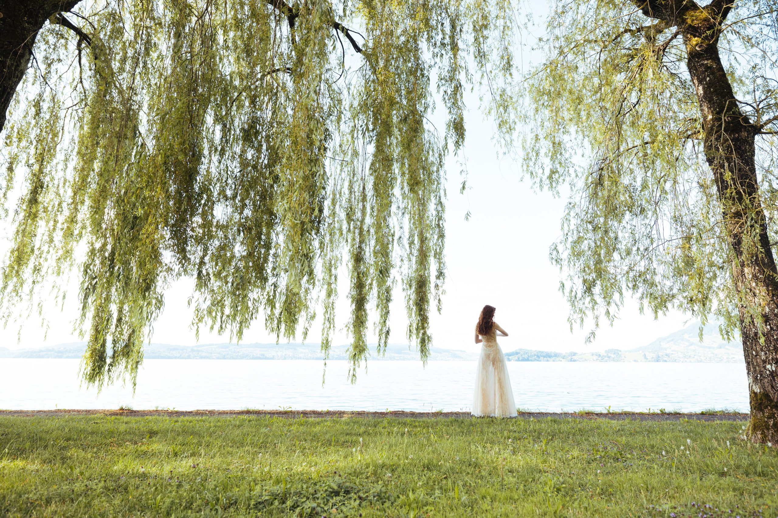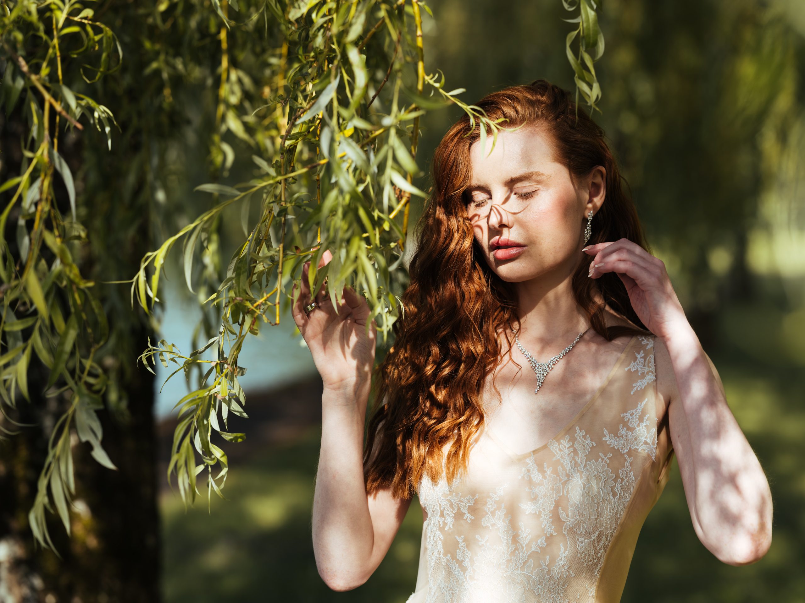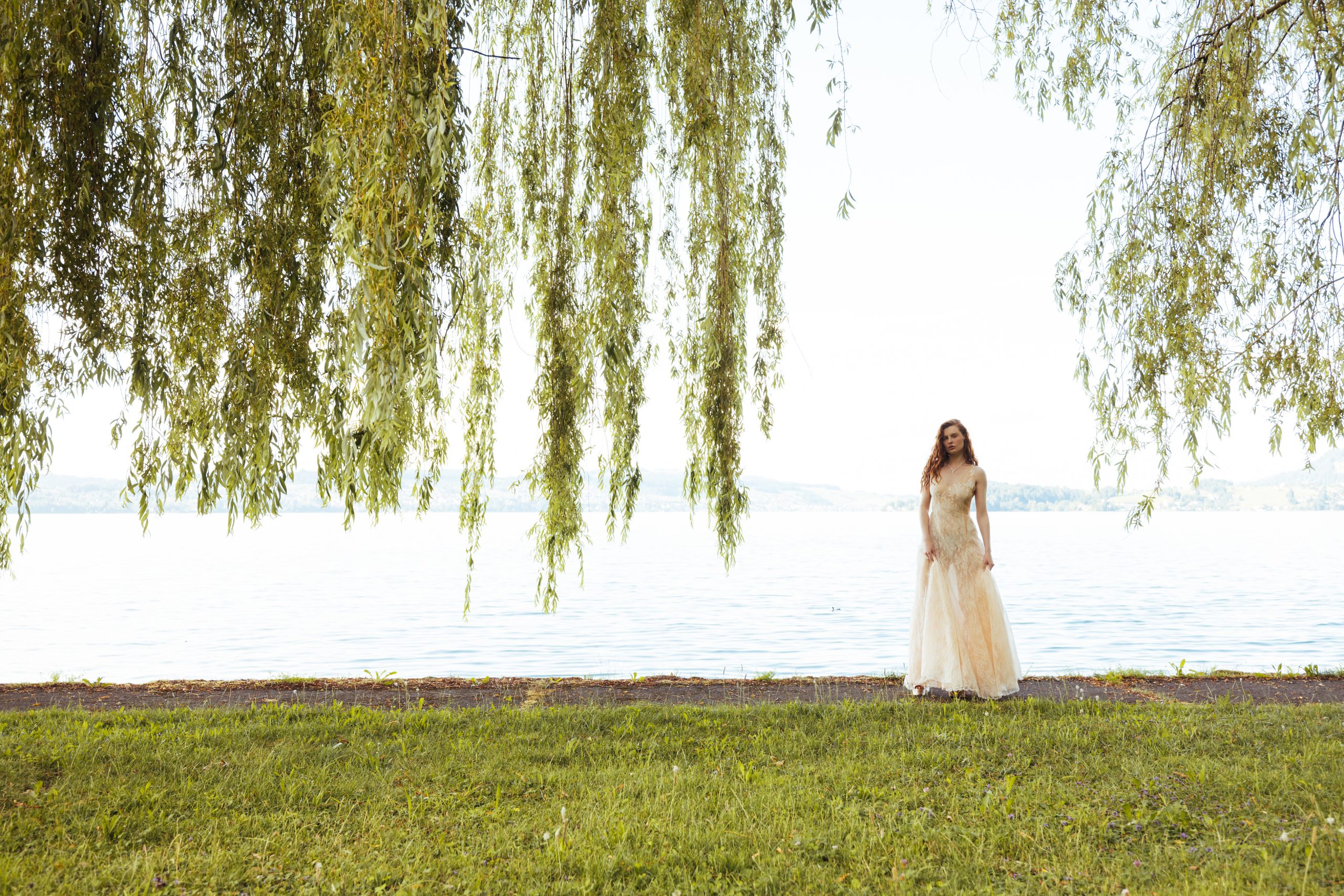 Crafted from nude silk organza, shaped into a fluid silhouette that softly contours to the body. We hand-embroidered an angelic motif across the back, radiating delicate sunbeams. The hand-embroidered Greek words describe a message of love and romance. French Chantilly lace overlays the organza, adding traditional couture detail. We hand-appliquéd the lace to ensure perfect placement. The result is a poetic, modern gown – quietly powerful, symbolic, and hand-finished to the highest standard.