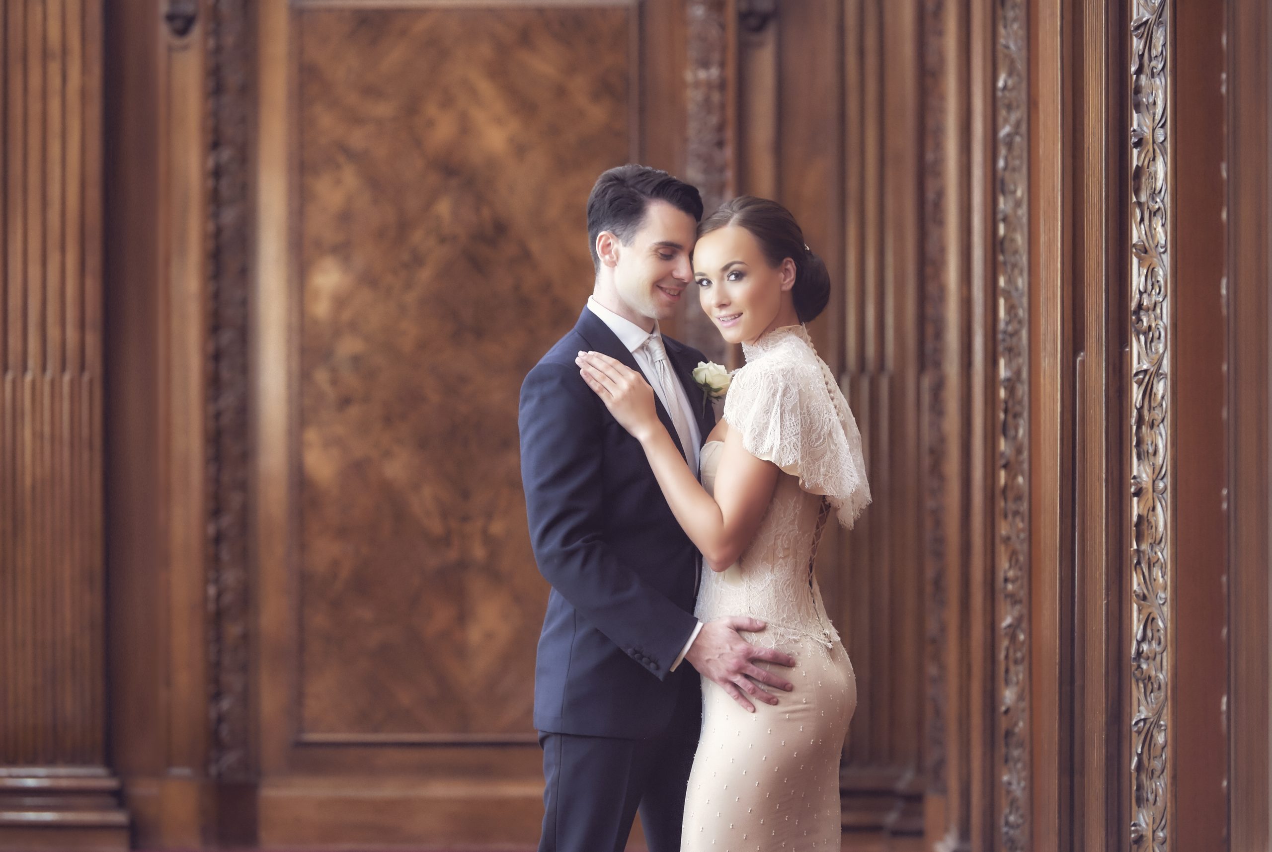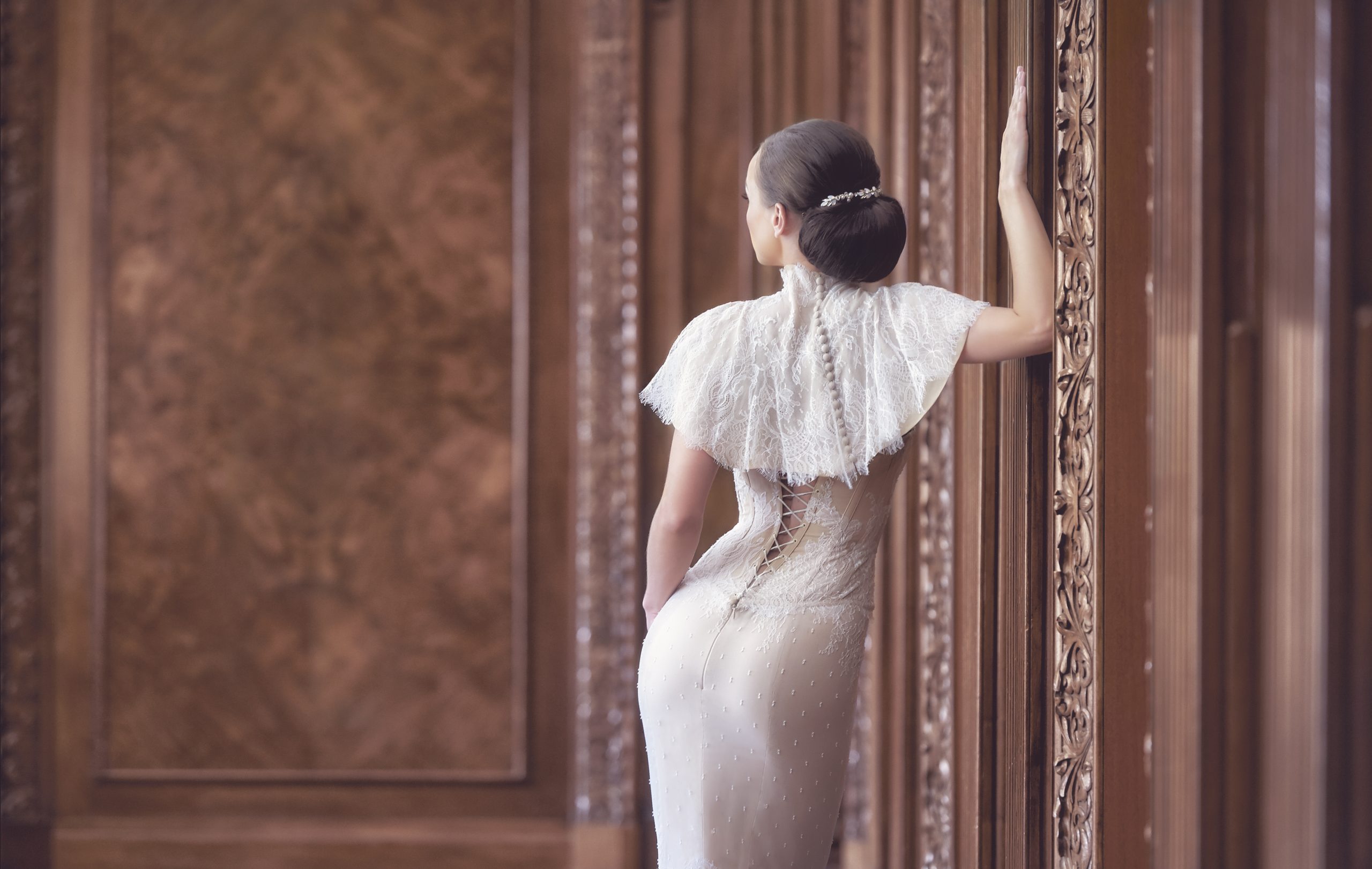 This sculpted fishtail gown is crafted from fluid silk georgette and layered with ivory French Chantilly lace, offering both softness and structure. The silhouette is fully corseted for a contoured, elegant fit that flares into a dramatic fishtail hem. Each lace motif is hand-appliquéd throughout, creating a seamless, refined finish that celebrates precision and craftsmanship. Timeless and graceful, this gown is designed to move effortlessly, balancing delicate texture with strong, architectural lines.