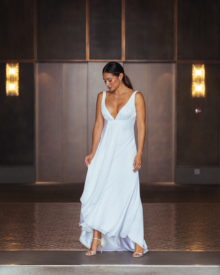 Crafted in white silk, this floor-length gown features a soft V-neckline, a high-low hemline, and a flattering draped cowl back. Our artisans adorned this bodice with delicately placed Swarovski© crystals, which continue into a cascading central drape. The silhouette is fluid and refined. This elegant gown balances minimalism and detail, perfect for understated glamour with a couture finish.