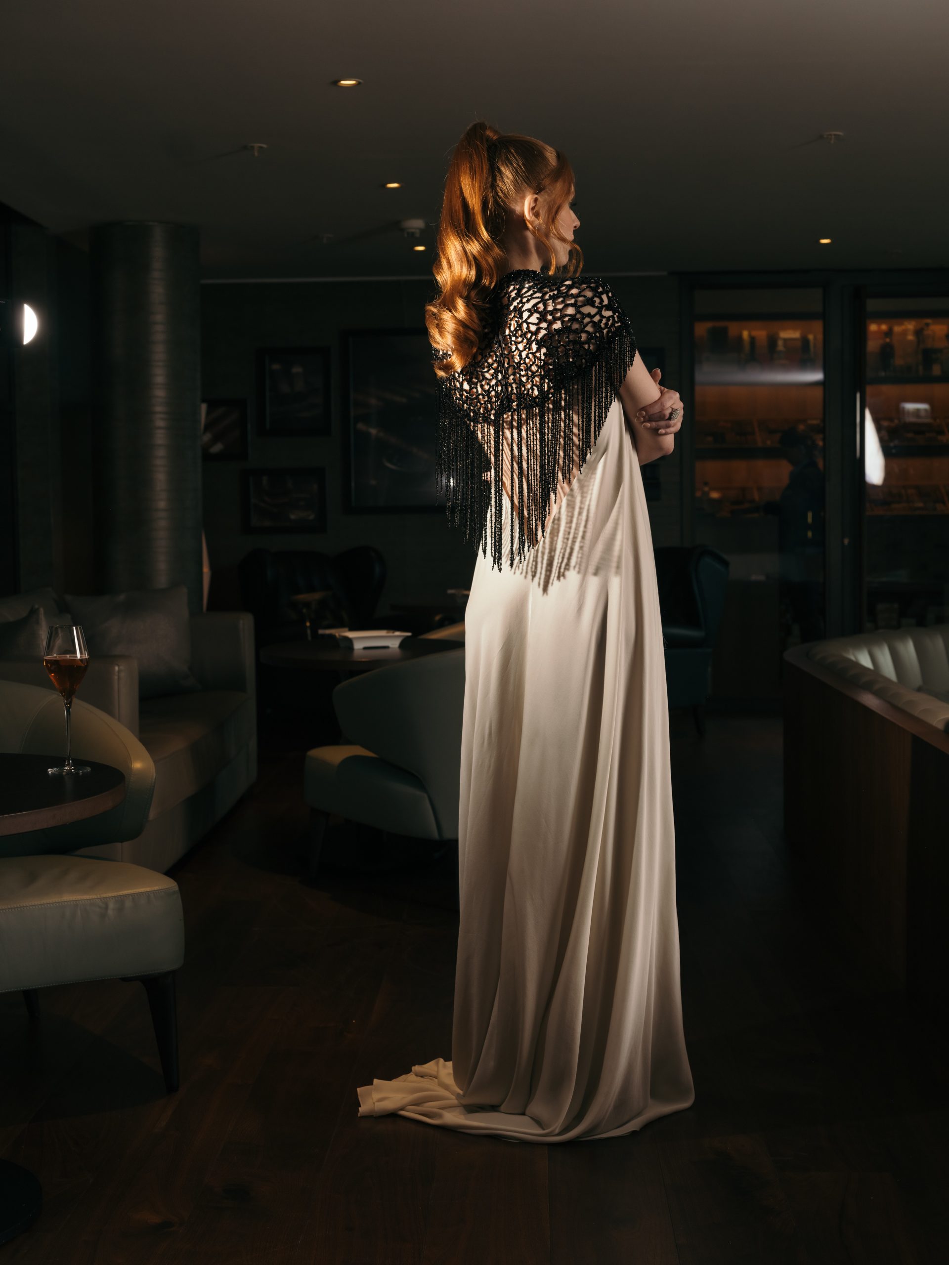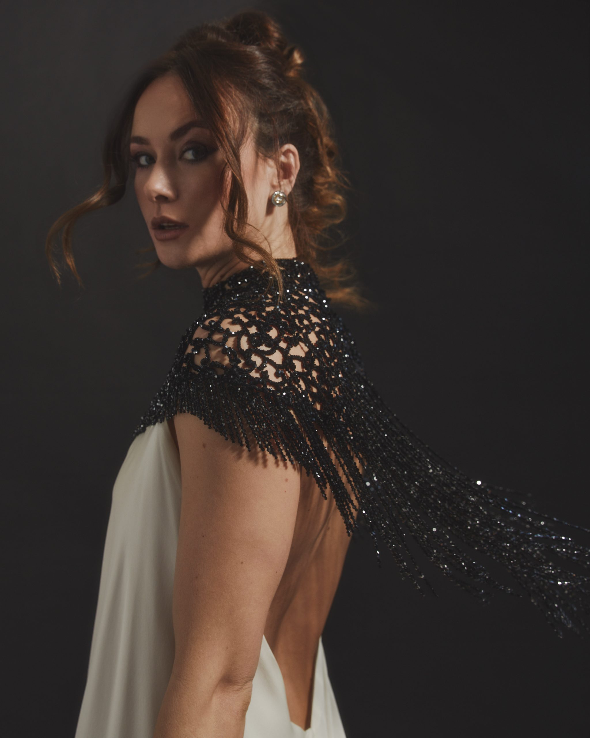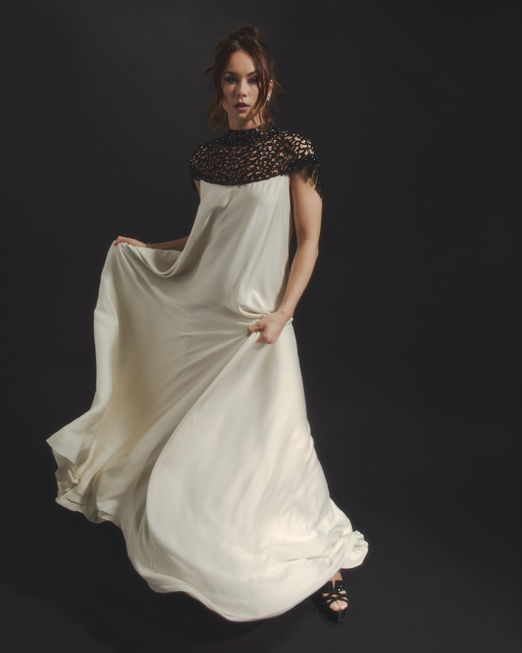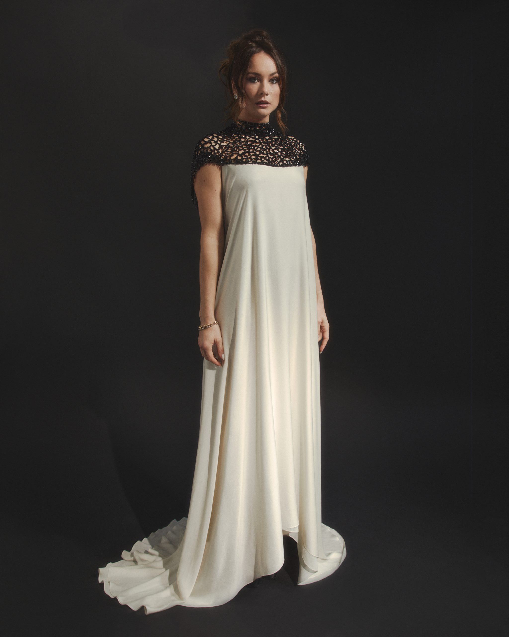 This gown is defined by an intricately hand-embellished collar, adorned with over 4,000 jet-black Swarovski© crystals set onto French lace. The striking neckline contrasts against the sleek elegance of the design, drawing the eye to its artisanal detail. The main body of the dress is crafted from elegant white satin chiffon, cut with fluid lines to create movement and grace. A balance of drama and refinement, this piece embodies couture artistry.