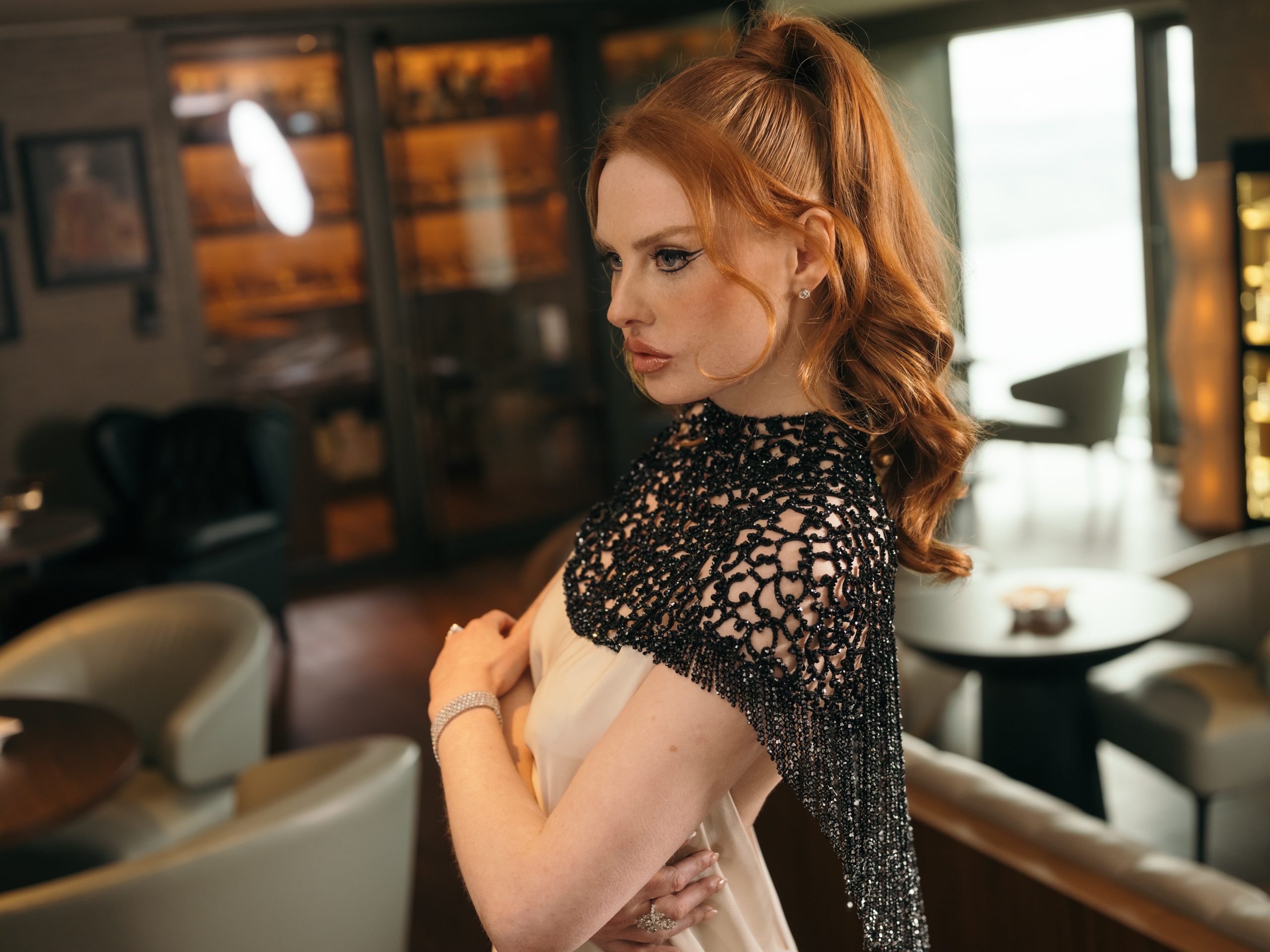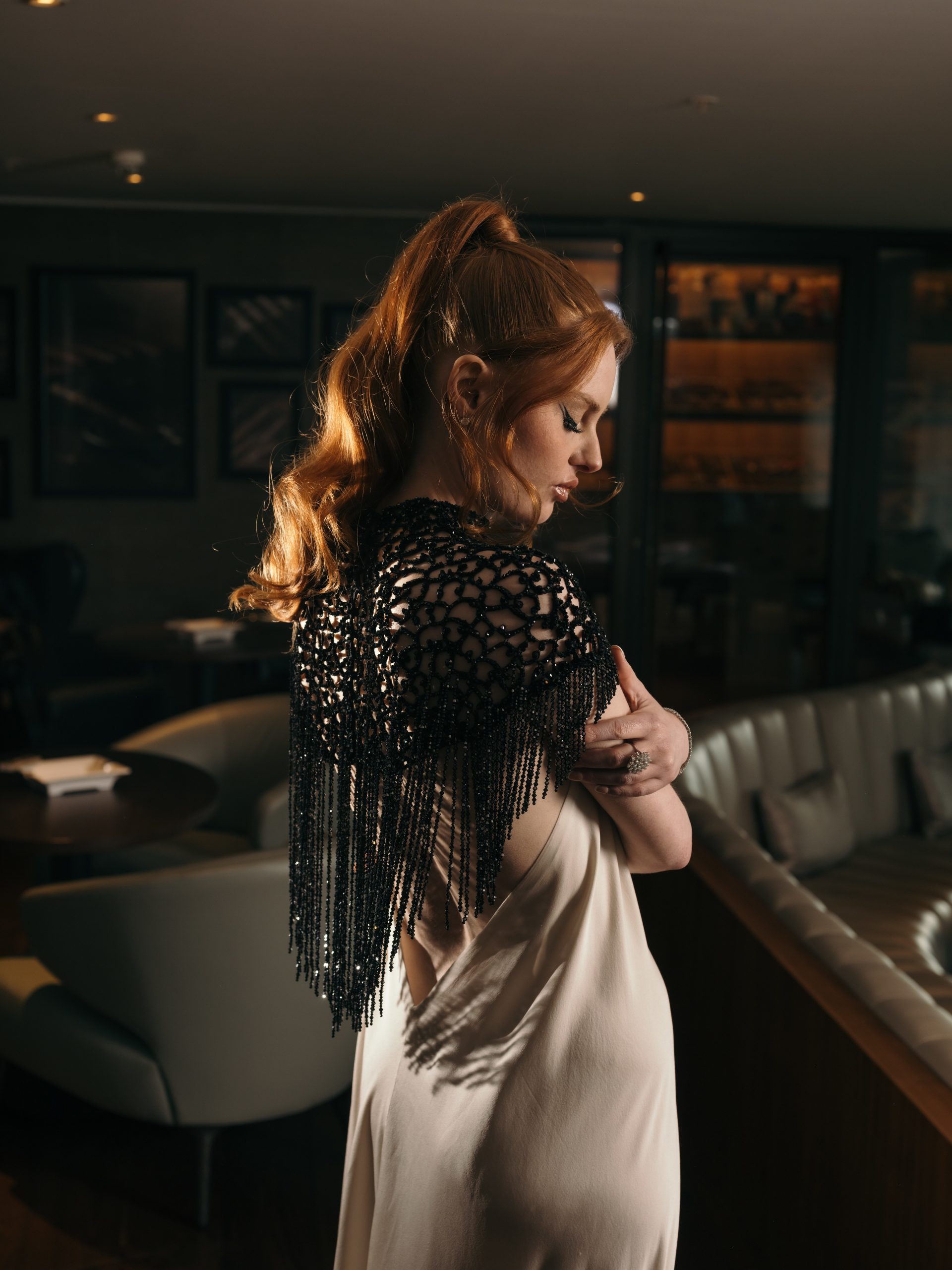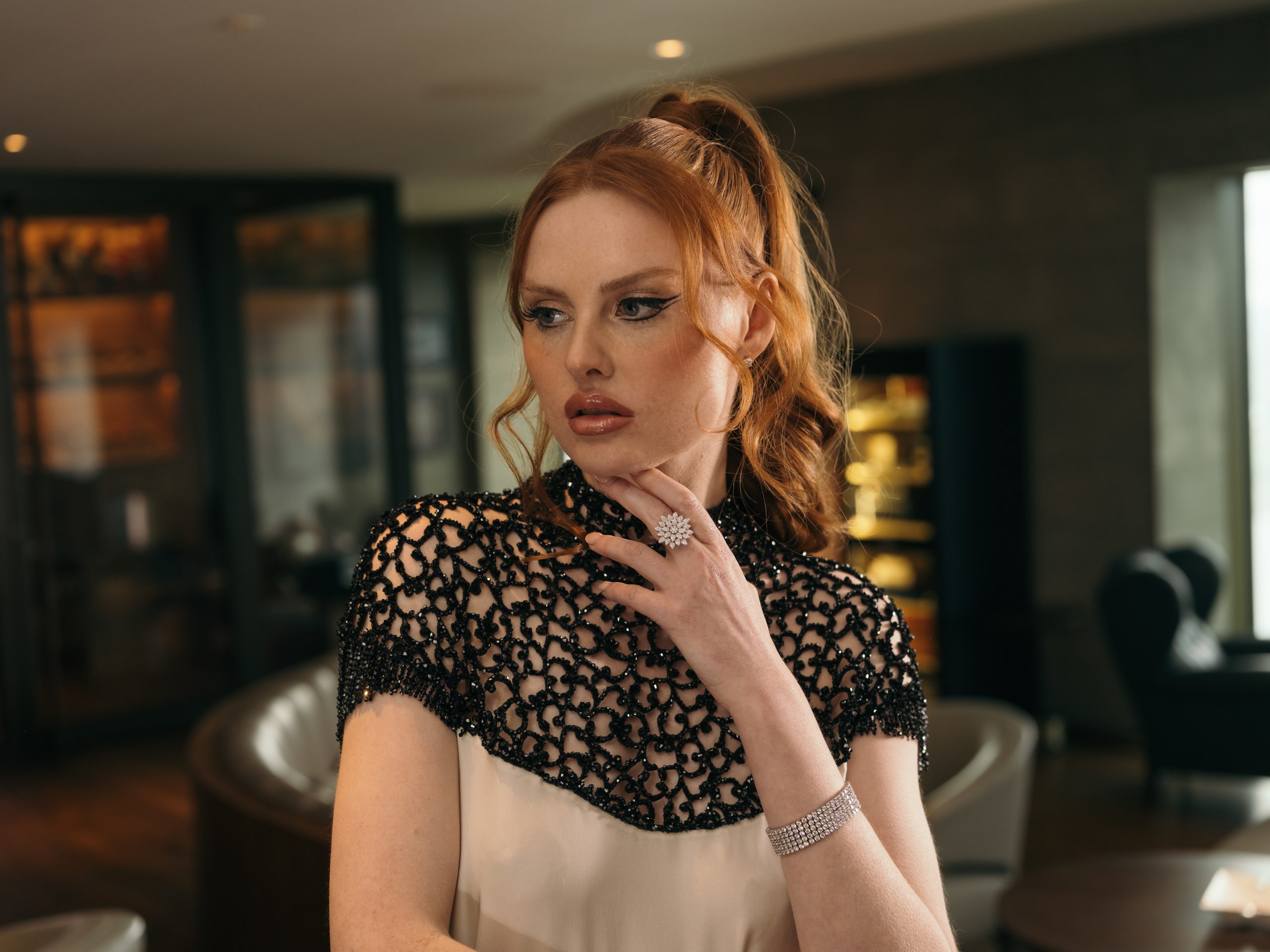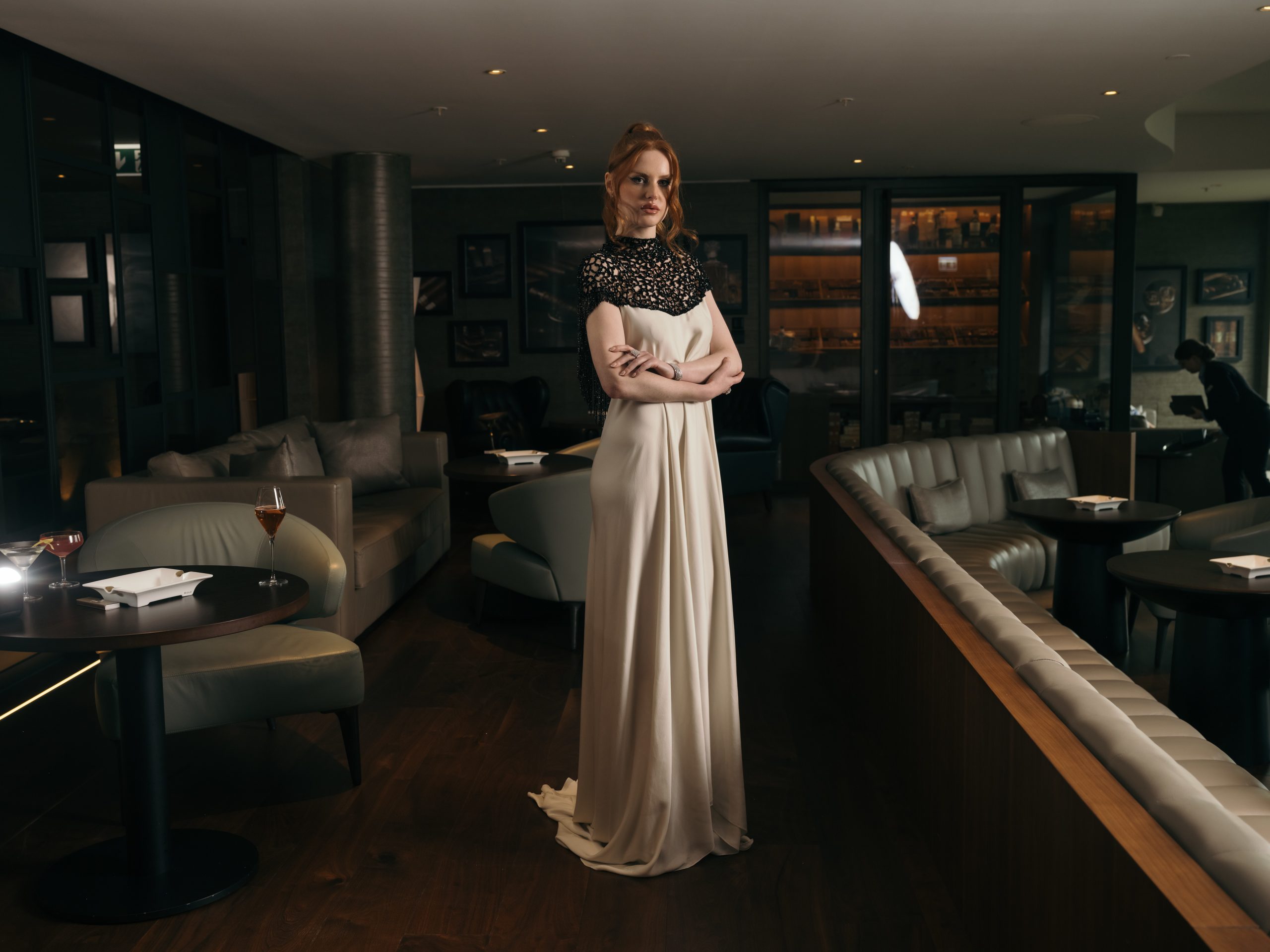 This gown is defined by an intricately hand-embellished collar, adorned with over 4,000 jet-black Swarovski© crystals set onto French lace. The striking neckline contrasts against the sleek elegance of the design, drawing the eye to its artisanal detail. The main body of the dress is crafted from elegant white satin chiffon, cut with fluid lines to create movement and grace. A balance of drama and refinement, this piece embodies couture artistry.