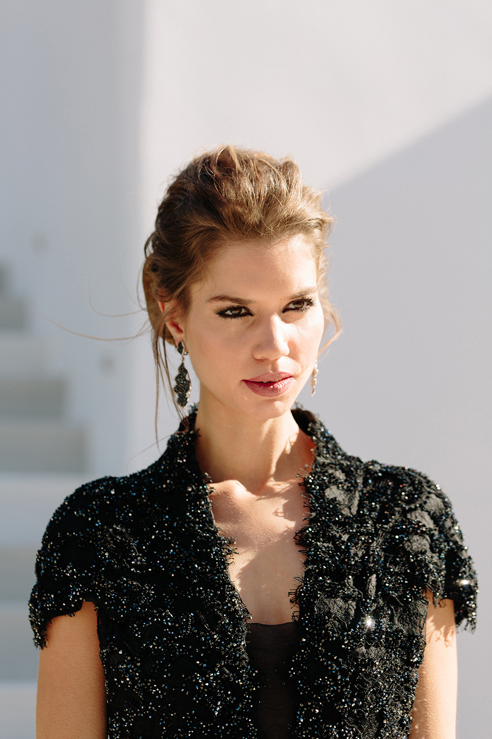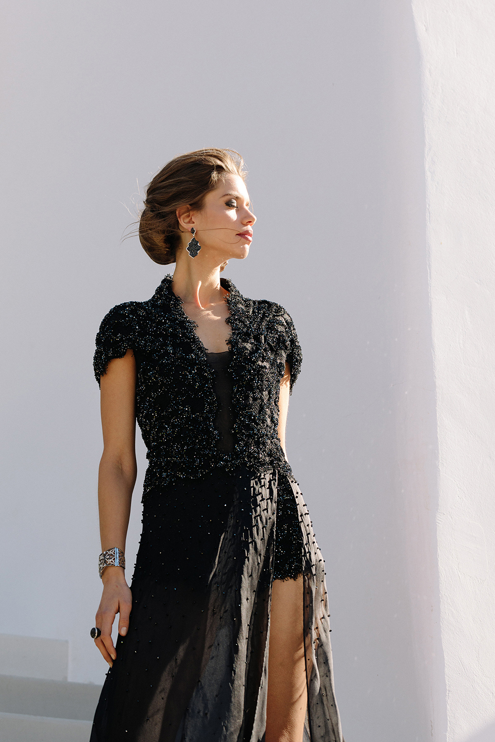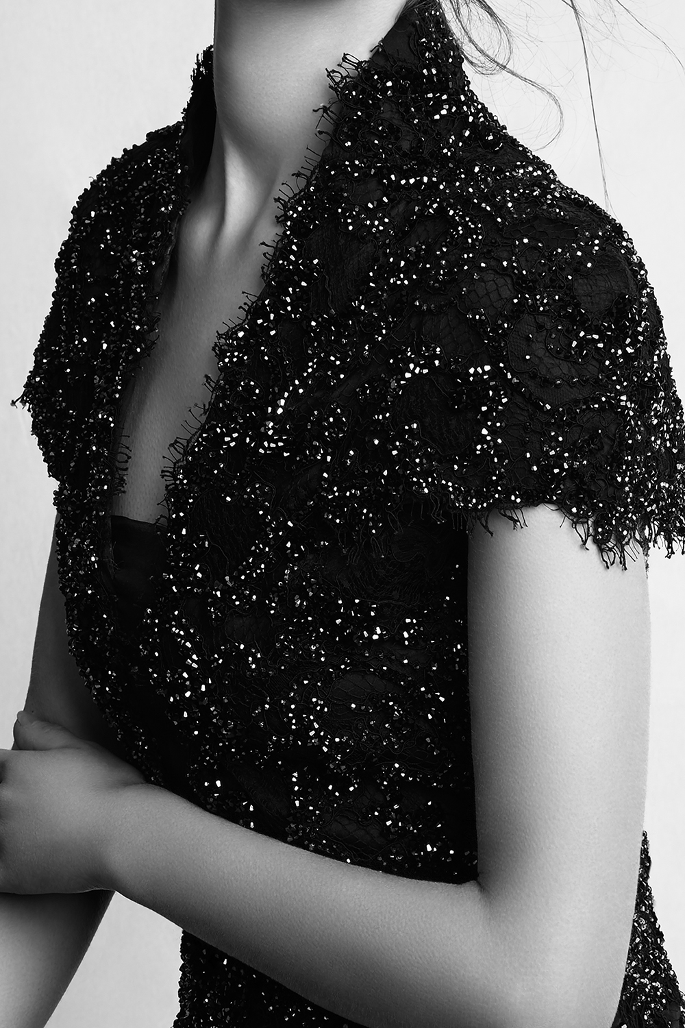 This couture playsuit is crafted from hand-appliquéd French corded lace. A dramatic full silk organza overskirt creates layered movement. Artisans embellish the design with over thirty thousand Swarovski© crystals. The gown shimmers with light across both body and skirt. Structured lace contrasts against the fluid organza with precision. The silhouette strikes a balance between modernity and opulence. Every detail celebrates meticulous craftsmanship and couture artistry at its most refined.