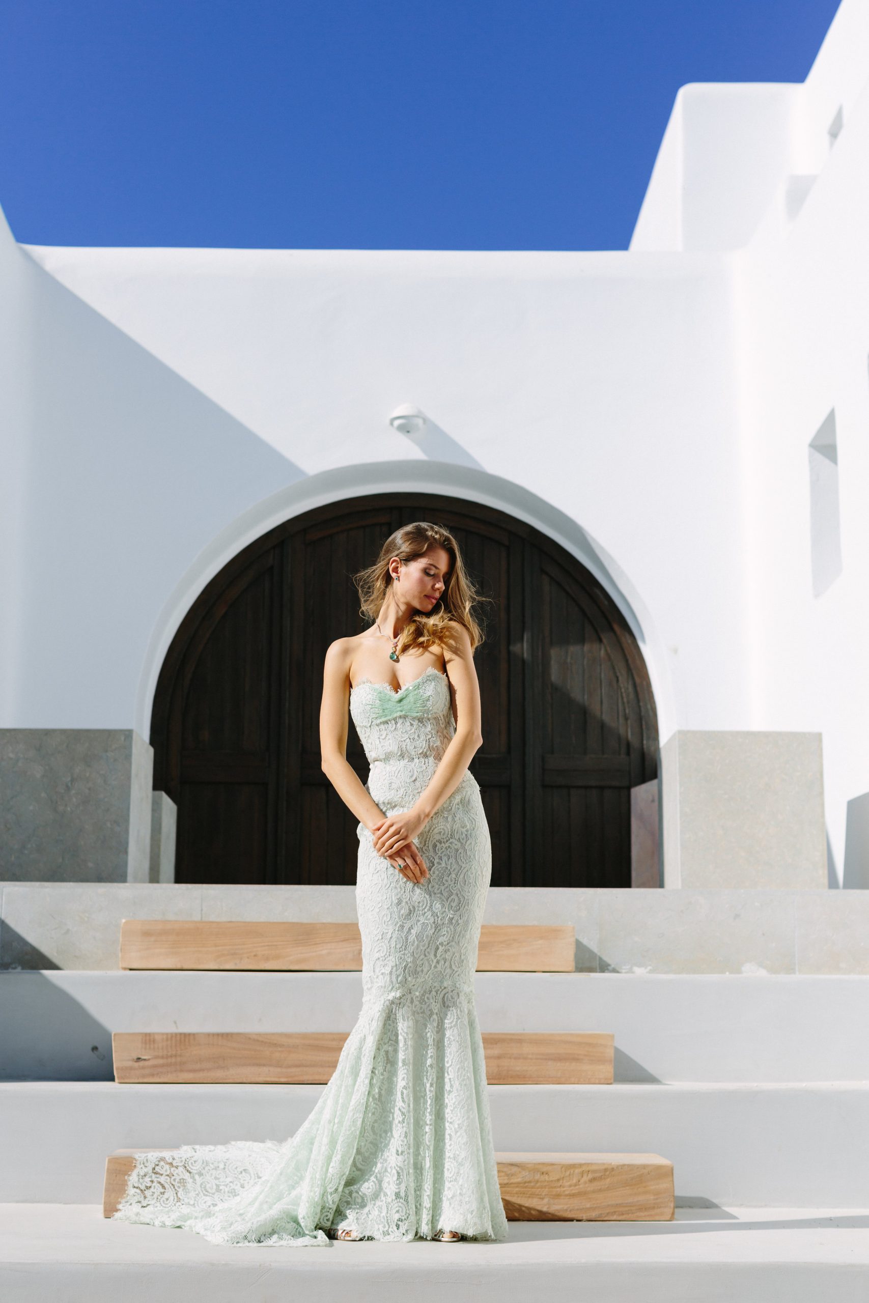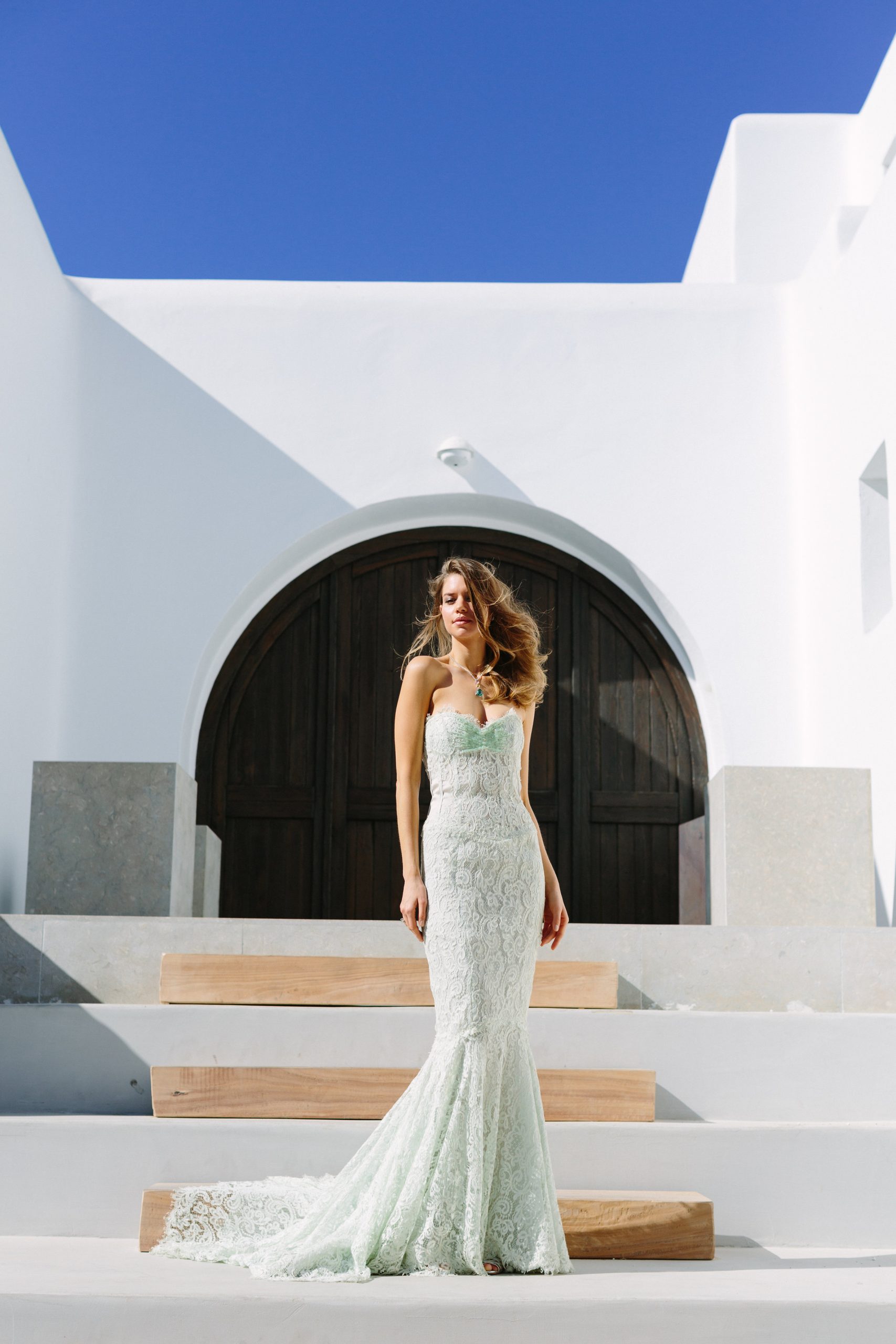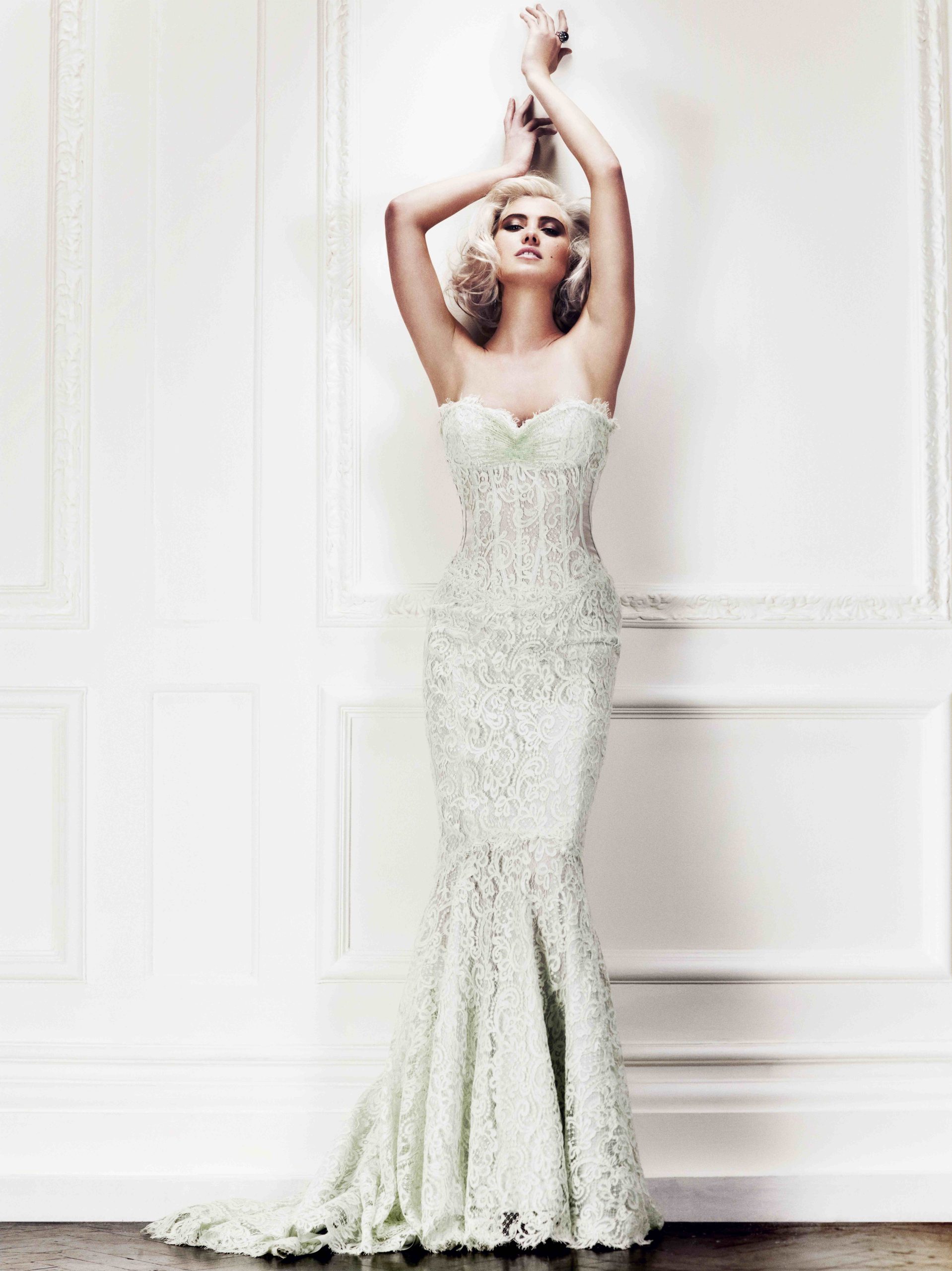 This Mint Green Gown is crafted in French corded lace, with its corseted bodice cut to a graceful sweetheart neckline that sculpts and defines the silhouette. Hand-appliquéd lace ensures a seamless finish, highlighting the intricacy of the fabric. Across the bust, a delicate burst of Swarovski© crystals adds luminosity and refined embellishment. Feminine and romantic, this gown balances structured corsetry with light, artisanal detail, embodying the timeless artistry of couture.