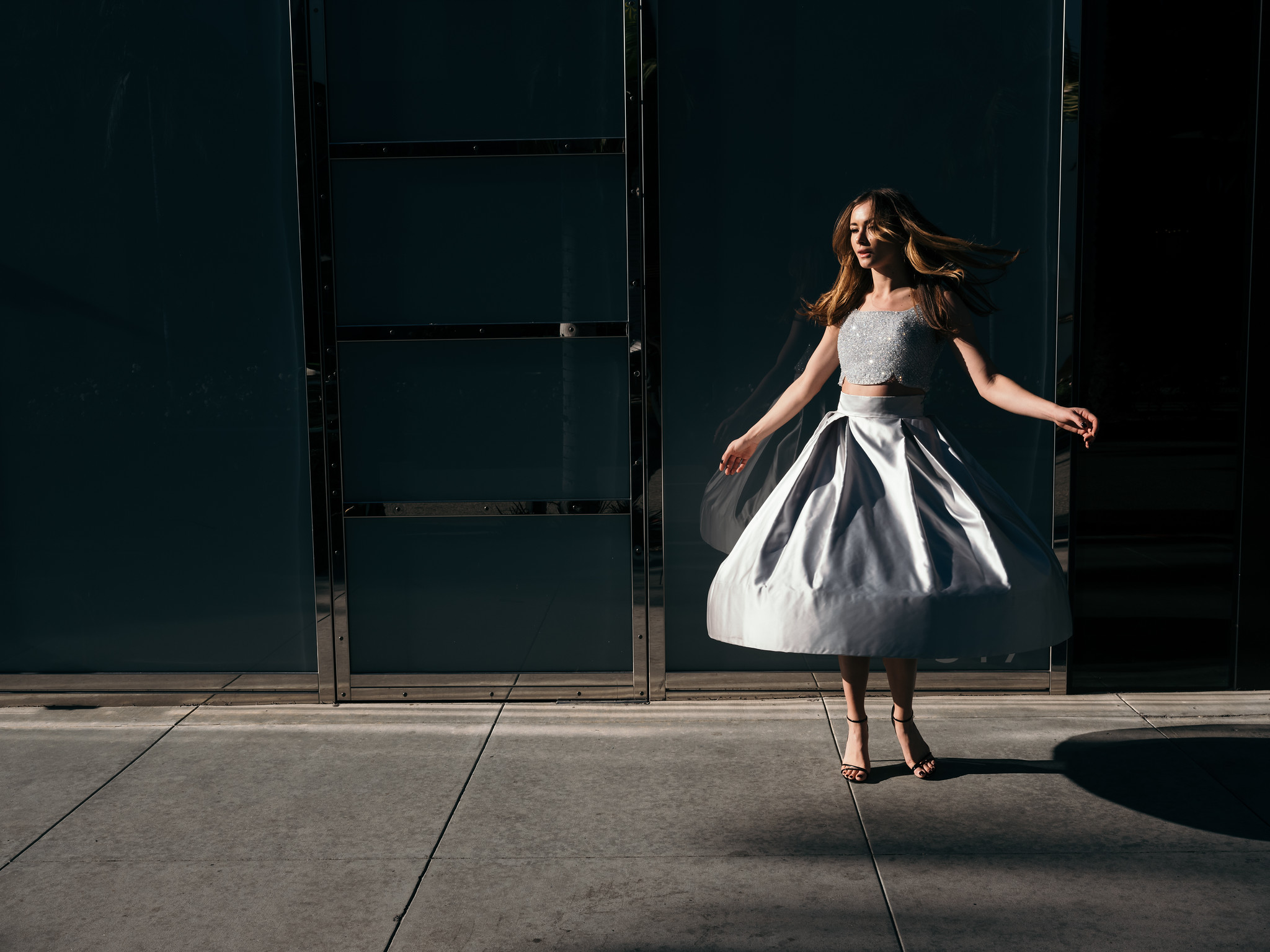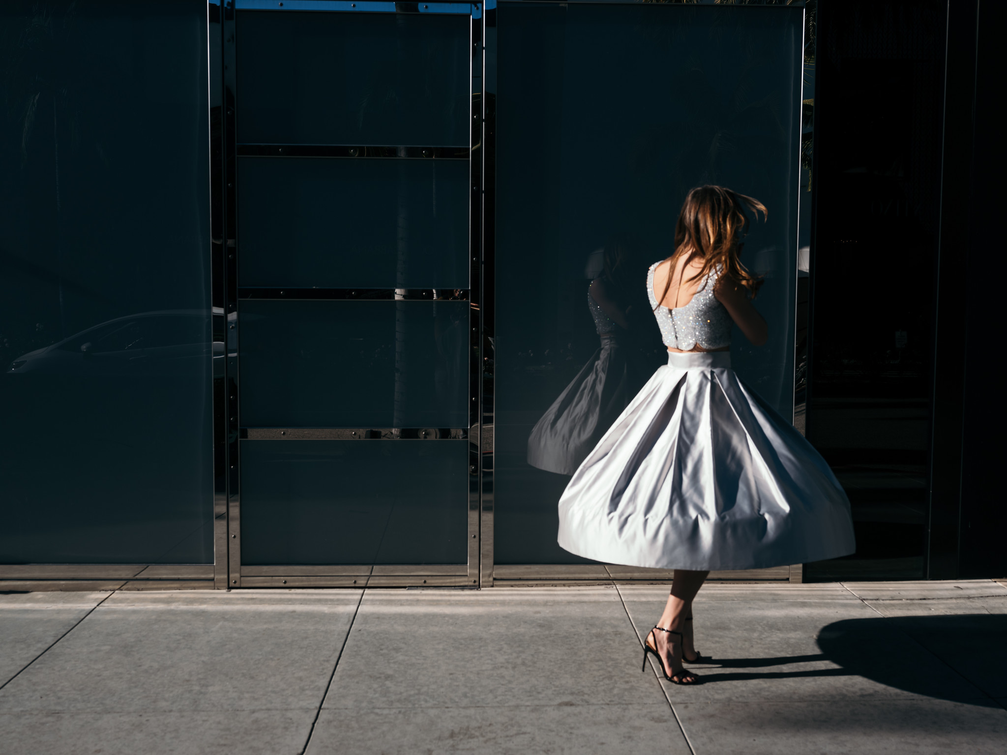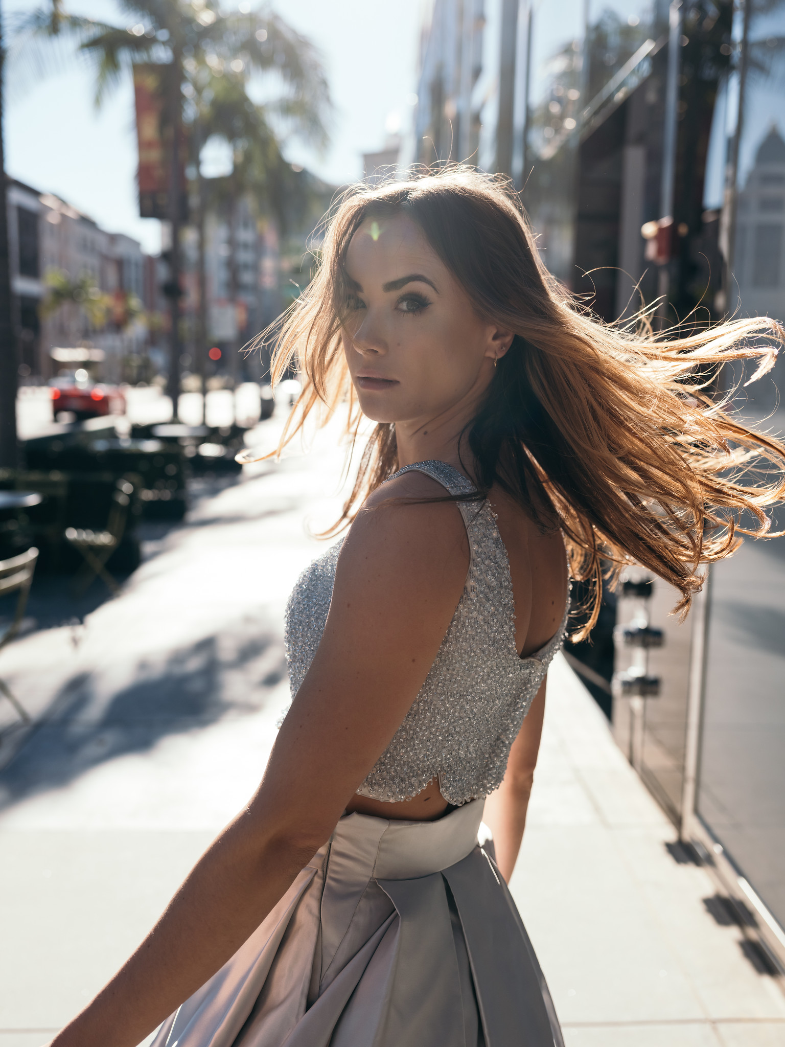 This pale blue crop top is delicately hand-embellished with over 14,000 Swarovski© crystals. Artisans sew each crystal individually as a radiant droplet. The embellishment catches and reflects light with precision. A structured ball skirt in silver Duchess satin completes the ensemble. The lustrous skirt is cut to a flattering midi length. The silhouette combines bold femininity with refined couture detail. The look shimmers with movement, embodying grace, contemporary style, and meticulous craftsmanship.